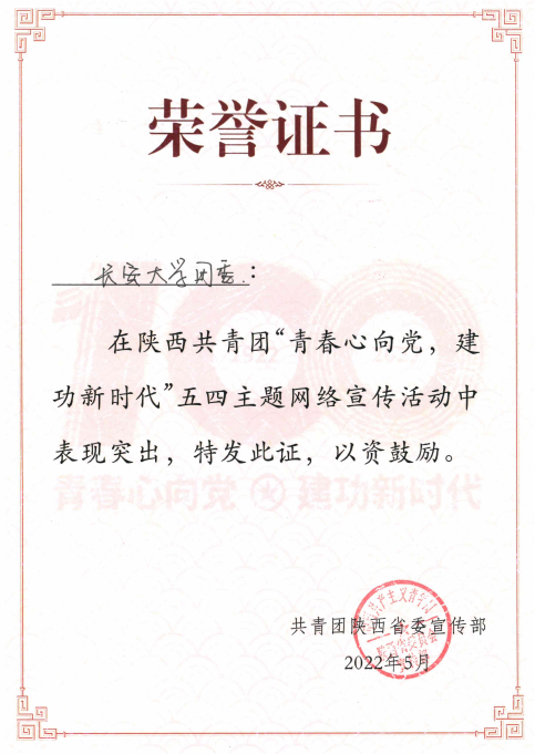 在今年五月舉辦的陜西共青團“青春心向黨,建功新時代”五四主題網絡宣傳活動中,我校共青團圍繞慶祝中國共青團成立100年,參與錄制團省委《驕傲的少年》MV,并創作《與長安·共青春》《長大青年》和《我和團徽團旗合個影》等一批主題鮮明、內容豐富、影響廣泛的優秀網絡文化作品,深受廣大團員青年歡迎與喜愛。