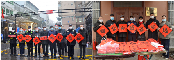 為感謝后勤處和保衛處工作人員不顧嚴寒堅守崗位,在疫情防控工作中付出的艱辛努力,特把春聯和福字送到仍在防疫一線值守人員手中,執勤人員拿到開心地說:“非常感謝各位老同志們送來的春聯、福字、關心和溫暖,我們會帶著這些祝福,繼續堅守崗位,為居民的健康保駕護航?!?/p>