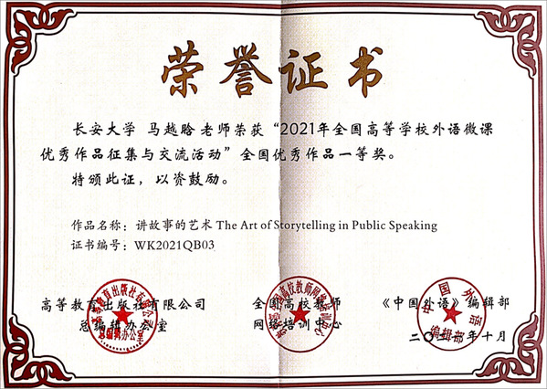 本次活動共征集到來自全國640所學校的1436件微課作品,經專家評審,共有219件作品進入全國交流活動環節,我校有4件作品獲得陜西省一等獎并晉級全國交流活動。經說課展示與專家評審,我校外國語學院馬越晗副教授獲得全國一等獎,張秋霞老師獲得全國二等獎,楊巧蕊、李致遠老師獲全國三等獎。