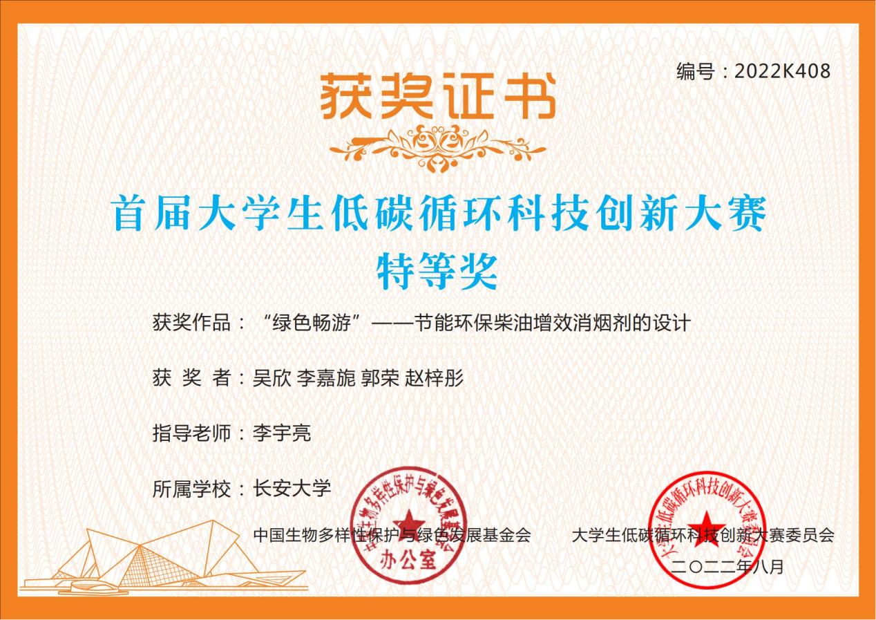 8月17日,由中國生物多樣性保護與綠色發(fā)展基金會(國家一級學會)主辦的首屆全國大學生低碳循環(huán)科技大賽落下帷幕。經過網絡評審、視頻匯報、線上答辯、評委線下打分等環(huán)節(jié)激烈角逐,由我校水利與環(huán)境學院教師李宇亮指導,吳欣、李嘉旎、郭榮、趙梓彤完成的參賽作品《“綠色暢游”——節(jié)能環(huán)保柴油增效消煙劑的設計》獲特等獎。