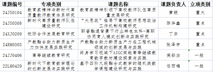 此次獲批的研究課題密切圍繞當前教育教學改革與教師發展關鍵問題,著力在推進教育家型教師隊伍建設、產教融合協同育人模式創新、新形態課程與教材建設等方面展開理論研究與實踐探索,具有較強的研究價值和示范效應。學校將繼續加強項目跟蹤管理,確保各項目高質量完成研究任務,持續深化學校教育教學改革,不斷提升人才培養質量。