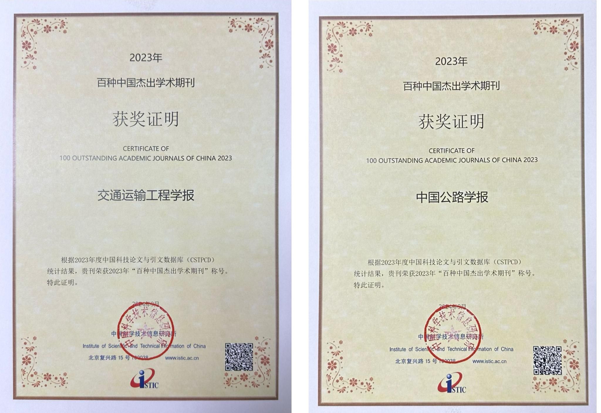 9月20日,2024年中國科技論文統計結果發布會暨中國一流科技論文世界影響力評價論壇在北京召開,中國科技信息研究所發布了2023年度百種中國杰出學術期刊名單和2024版中國科技核心期刊目錄。根據會議發布結果,我校《中國公路學報》《交通運輸工程學報》入選2023年百種中國杰出學術期刊。這分別是我校兩大學報第19次、第16次入選百種中國杰出學術期刊。