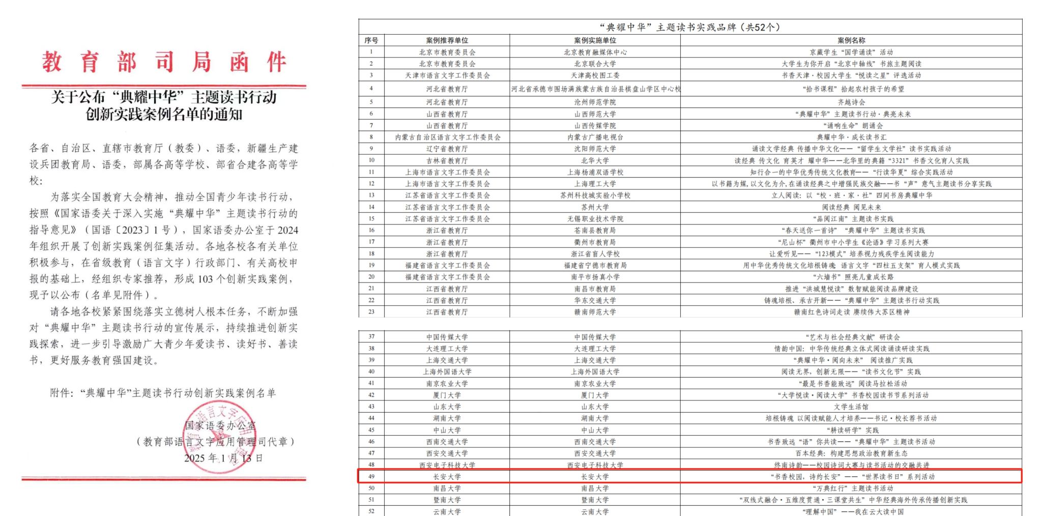 近日,國家語委辦公室印發《關于公布“典耀中華”主題讀書行動創新實踐案例名單的通知》,我校“書香校園,詩約長安”——“世界讀書日”系列活動入選“典耀中華”主題讀書實踐品牌。