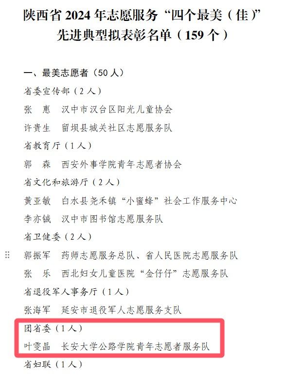近日,陜西省委社會工作部、省委宣傳部、省民政廳、省人力資源和社會保障廳、省衛(wèi)健委等部門在全省組織開展的陜西省志愿服務(wù)“四個最美(佳)”先進典型學習推選活動結(jié)果公布。我校公路學院青年志愿者服務(wù)隊葉雯晶榮獲“最美志愿者”(全省50人)。