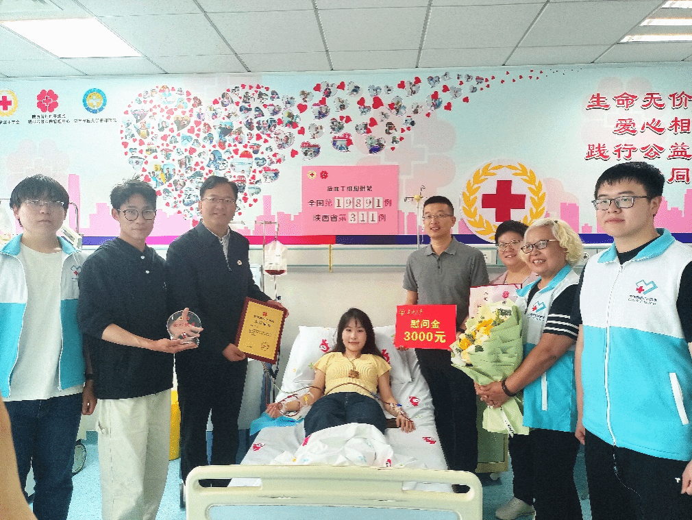 捐獻(xiàn)當(dāng)日上午,陜西省紅十字會(huì)黨組成員、副會(huì)長(zhǎng)李志剛,我校團(tuán)委、材料學(xué)院相關(guān)負(fù)責(zé)人前往醫(yī)院看望張敔婷,對(duì)她樂(lè)于助人、無(wú)私奉獻(xiàn)的高尚品格給予充分肯定和高度贊揚(yáng),并代表學(xué)校送上慰問(wèn)品。陜西省紅十字會(huì)相關(guān)負(fù)責(zé)人為張敔婷頒發(fā)“中國(guó)造血干細(xì)胞資料庫(kù)陜西分庫(kù)愛(ài)心使者”和“捐獻(xiàn)造血干細(xì)胞”榮譽(yù)證書(shū)。