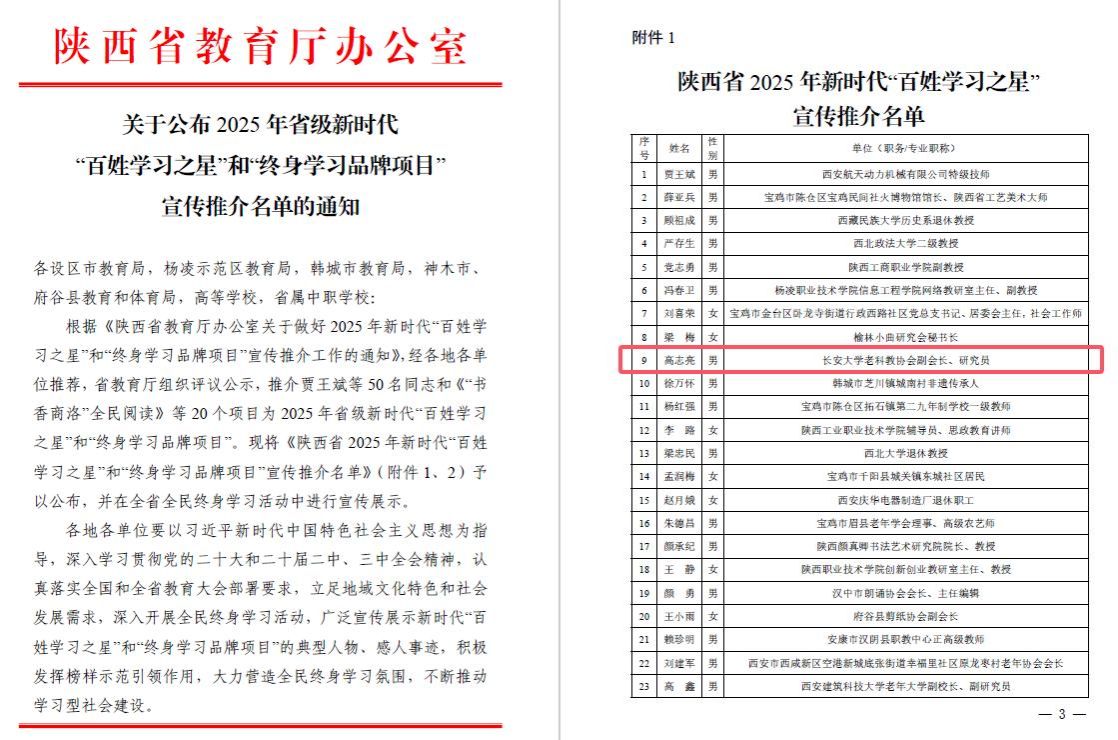 近日,陜西省教育廳辦公室下發《關于公布2025年省級新時代“百姓學習之星”和“終身學習品牌項目”宣傳推介名單的通知》文件,我校高志亮老師獲評陜西省“百姓學習之星”稱號。
