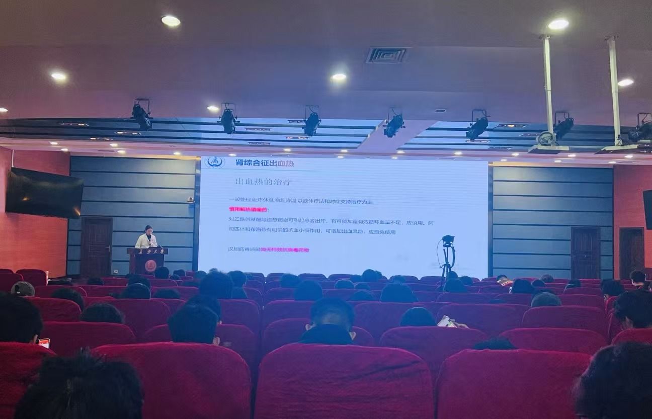 校醫院醫務科科長、內科主治醫師宋沂林擔任主講。她結合出血熱的病原學、流行病學特征、臨床癥狀、診斷治療等方面,為同學們進行了全面詳細的講解。她介紹了出血熱的早期癥狀,包括高熱、頭痛、腰痛、眼眶痛(三痛)、全身肌肉關節酸痛、眼球結膜及顏面部、頸部和上胸部皮膚充血潮紅(三紅)等。宋沂林醫生提醒同學們,一旦出現這些癥狀,應立即就醫,以便及早診斷和治療。她還就如何預防出血熱疾病給出建議。滅鼠、防鼠是預防出血熱的關鍵措施,同時還應養成良好的衛生習慣,外出時做好個人防護,避免與鼠類及其排泄物接觸。此外,接種疫苗也是預防出血熱的有效手段。