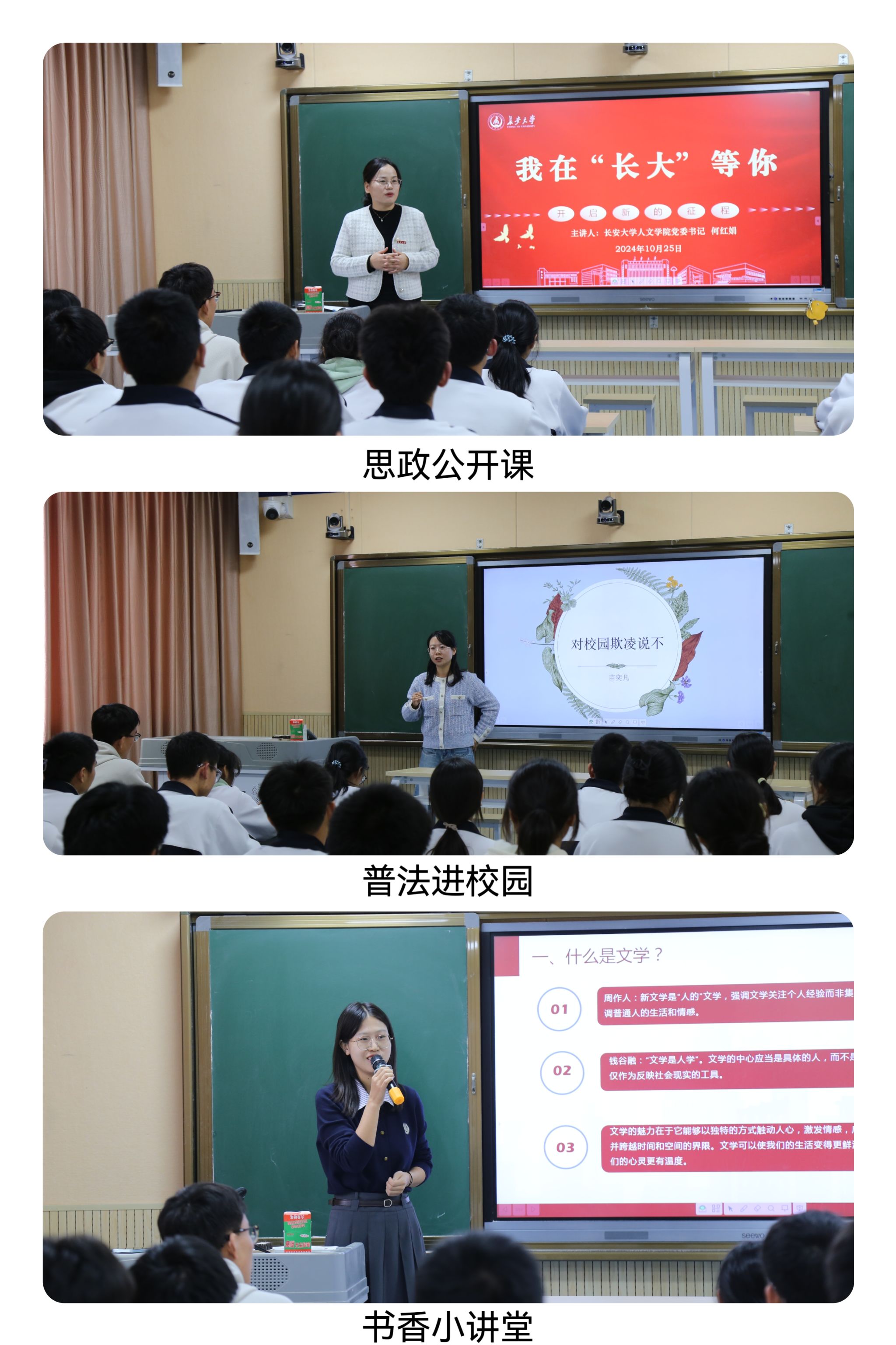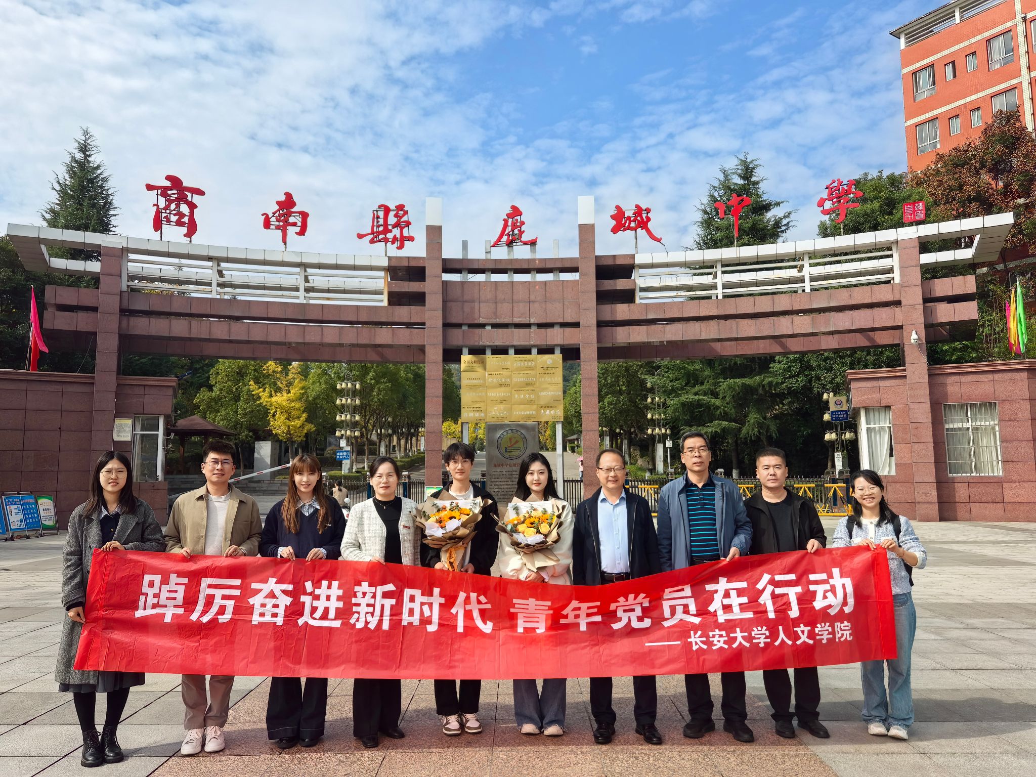10月25日上午,何紅娟一行人赴商南縣高級中學開展以“黨建引航聚合力 教育賦能鑄未來”為主題的黨建結對共建活動。商南縣副縣長馬飛,商南縣高級中學黨委書記蘇小明,校長江文宏,副校長石龍勝及機關部門負責人參加了共建活動。幫扶隊在學校開展了形式多樣的微課堂。何紅娟開展了以《我在“長大”等你》為主題的思政公開課,介紹了長安大學的辦學理念、課堂模式、學科專業等情況,并寄語同學們要心存希望,追光而遇,做一個勇敢的逐夢人;目有繁星,星辰大海,做一個執著的追光者;行有所往,向陽而生,做一個堅定的奮斗者;勇于革命,完善自我,做一個無畏的挑戰者,鼓勵高三學生增強韌性、勇敢追夢。人文學院法學系苗奕凡博士、中文系梁琚雯博士分別做了題為《二十世紀中國文學史的發展脈絡》及《對校園霸凌說不》的專題講座。隨后,何紅娟代表學院向商南縣高級中學捐贈有關書籍。
