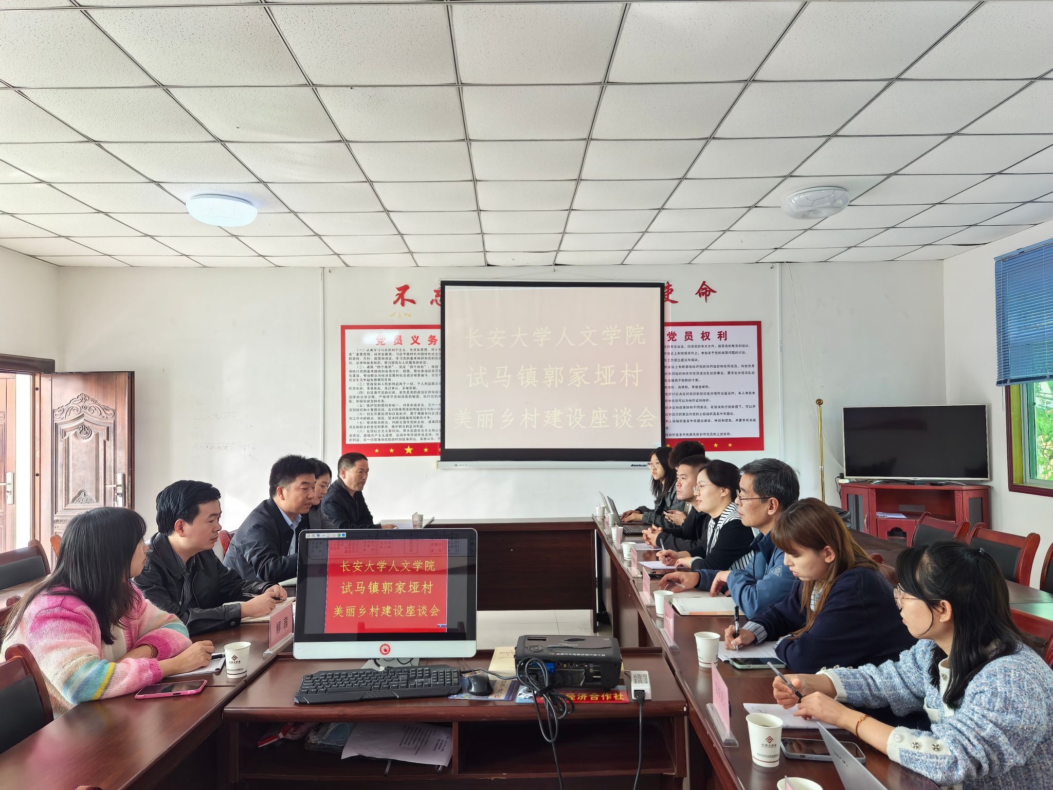 10月24日下午,何紅娟一行8人赴商南縣試馬鎮郭家埡村與村政府工作人員開展鄉村振興美麗鄉村建設座談會。會上,試馬鎮黨委副書記、鎮長陳濤詳細介紹了鎮上發展情況及現存的瓶頸問題。針對相關問題,學院青年黨員教師積極獻言獻策,并表示愿意在今后的幫扶過程中提供智力支持。何紅娟表示,在國家實施鄉村振興戰略的背景下,人文學院將積極對接郭家埡村發展需求,持續發揮學院學科專業和人才優勢,在美麗鄉村建設、鄉村治理、文化宣傳、基層黨務、普法下鄉、普通話推廣等多個領域開展合作,助力郭家埡村早日實現農業農村現代化,打造產業興旺、生態宜居、鄉風文明、治理有效、生活富裕的美麗家園。