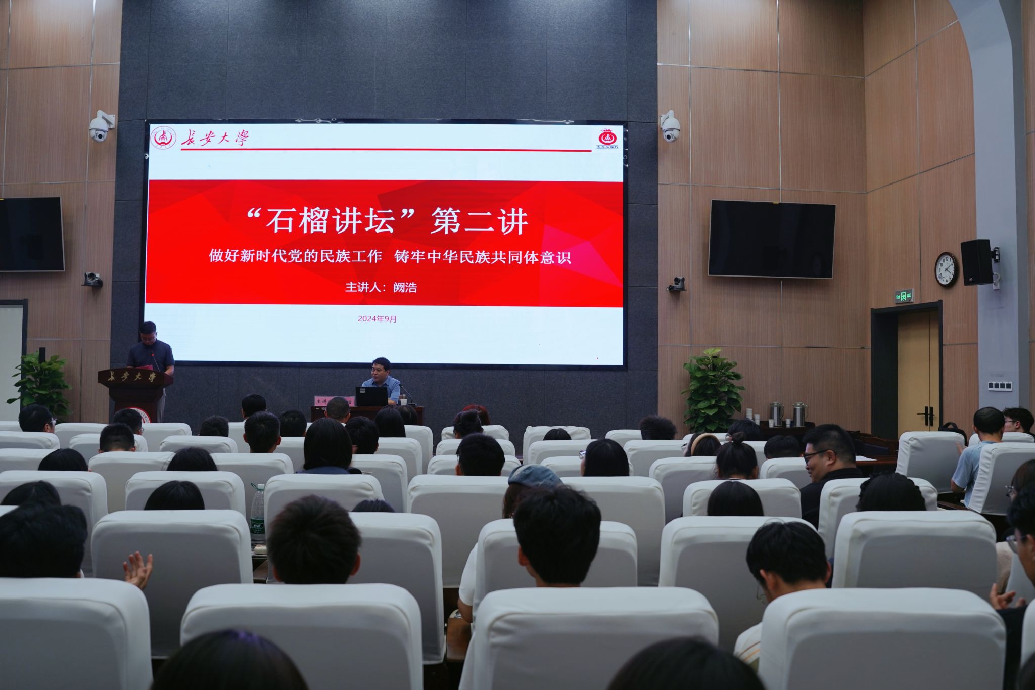9月25日下午,學工部聯合關工委在北校區師生服務大廳第二報告廳舉辦“石榴講壇”第二講,邀請陜西省民族宗教事務委員會民族一處副處長闕浩作題為《做好新時代黨的民族工作,鑄牢中華民族共同體意識》的專題報告。報告由學工部副部長劉鵬主持。