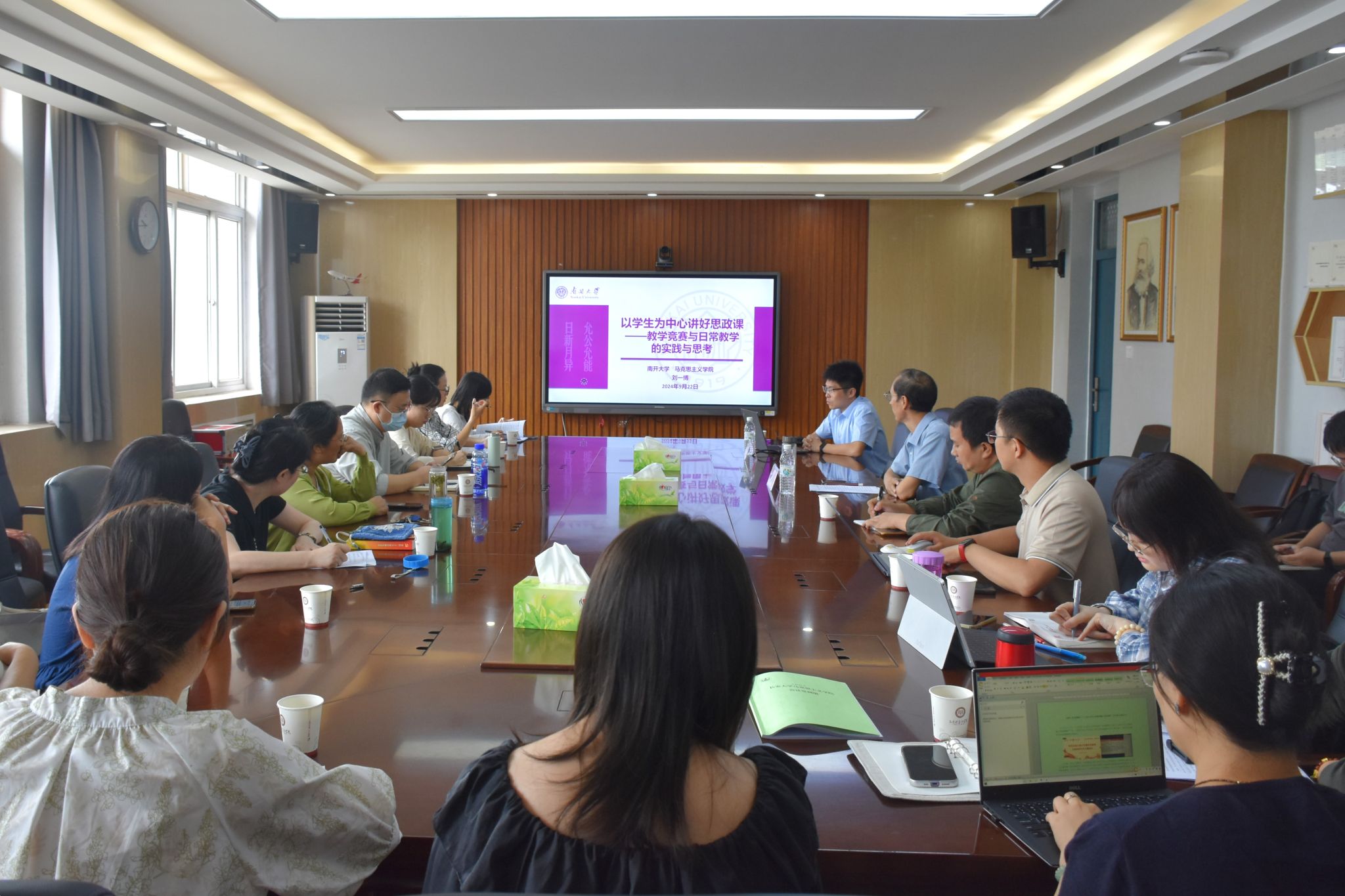 會議邀請全國高校青年教師教學競賽思政課組一等獎獲得者、全國高校思政課教學展示一等獎獲得者、南開大學馬克思主義學院劉一博副教授作題為《以學生為中心講好思政課——教學競賽與日常教學的實踐與思考》的專題講座。劉一博結合自身參加教育部思政課教學展示活動以及青教賽等教學比賽的參賽經驗,向與會教師交流了在選題、教案編寫、教學課件制作、說課和授課等方面的心得體會,并結合自身教學和學生管理工作,深入闡述了如何把思政課講深、講透、講活。同時,劉一博結合具體的教學案例向青年教師講授了如何將“以學生為中心”的理念落實在教學實踐中,如何通過集體備課快速提升教學能力,如何將黨的創新理論融入思政課。