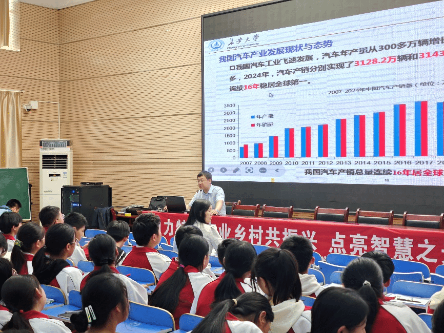 座談會同時,“交通運輸團”代表成員前往商南縣鹿城中學開展“助力特色產業鄉村共振興,點亮智慧之光科普強國行動”活動。汽車學院陳軼嵩教授、王飛老師分別作“汽車強國 科技報國”“智能汽車技術概論”科普講座,并向鹿城中學捐贈圖書。