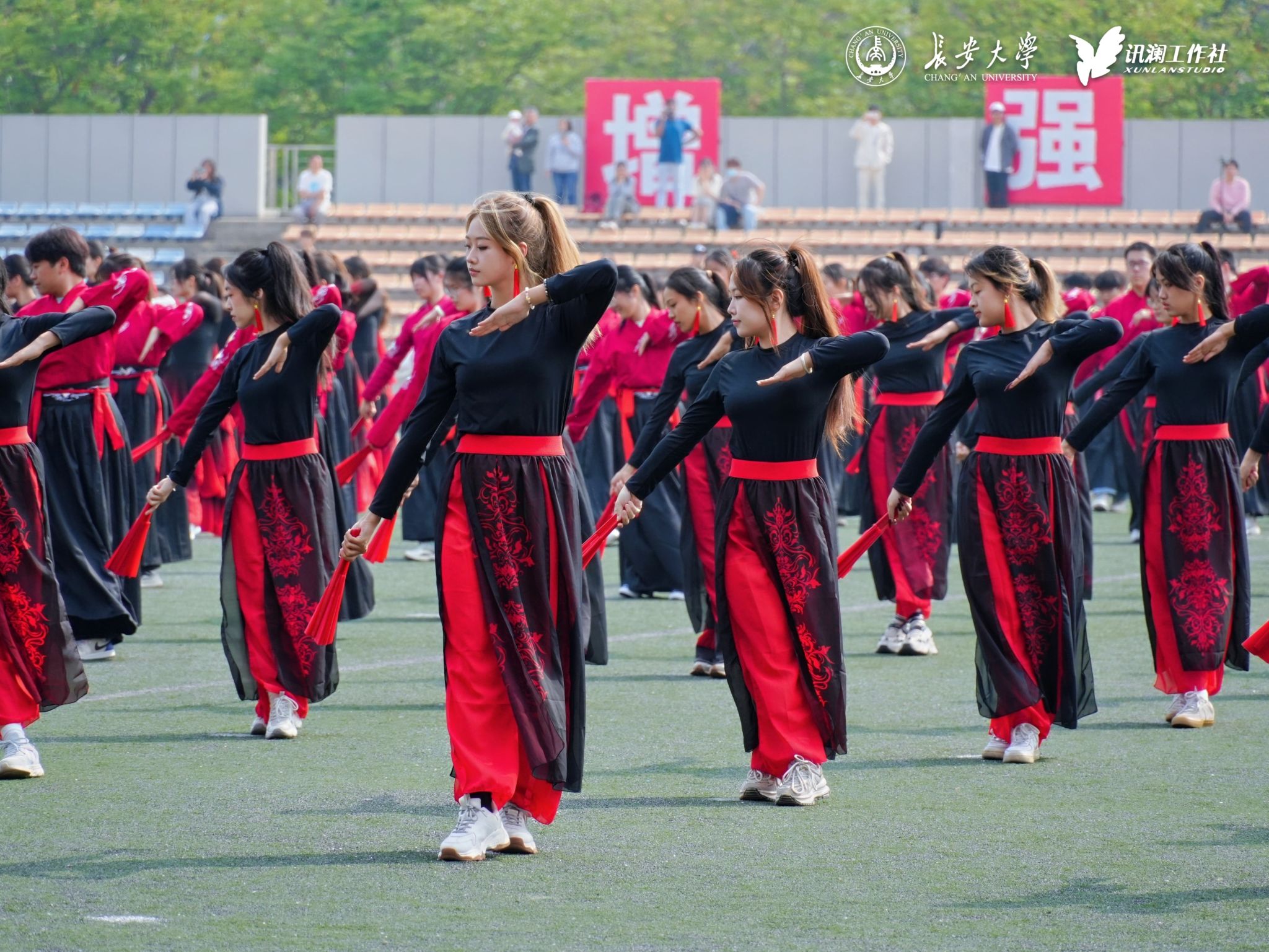 開場表演由武術表演和扇子舞表演組成。武術表演以氣勢恢宏的舞龍為開端,巨龍在陽光下熠熠生輝,翻騰跳躍;400人組成的八段錦表演方陣,以身體為筆,以動作為墨,揮灑出一幅生動的傳統畫卷;由我校跆拳道校隊和武術隊隊員帶來的表演充滿張力和激情;19個學院組成的扇子舞表演團隊舞步輕盈,彩扇翩翩,節奏鏗鏘,展現了我校學子的青春活力,這也是本次運動會的第一個團體比賽項目,成績將由校領導、各學院領導和評委共同為其打分。