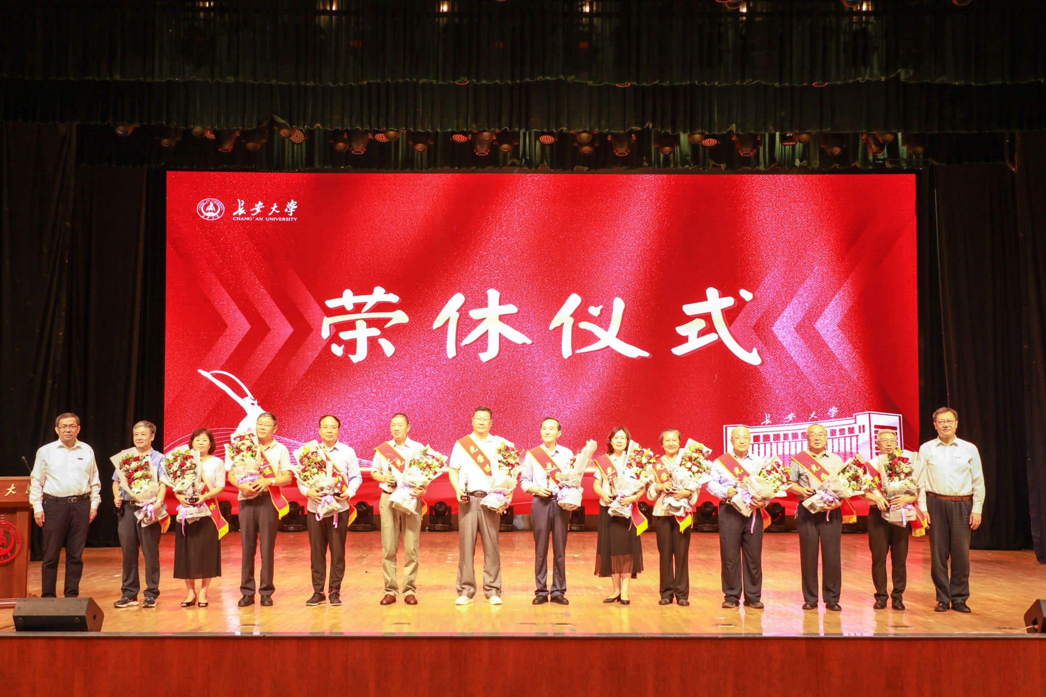 大會舉行了2023年度退休教師榮休儀式,學生代表向今年退休的12位教師代表獻花,陳志堅和沙愛民共同為退休教師頒發了榮休紀念品。大會還舉行了新教工入職儀式,退休教師代表為新教工代表佩戴校徽并發放《長安大學師德師風教育讀本》。