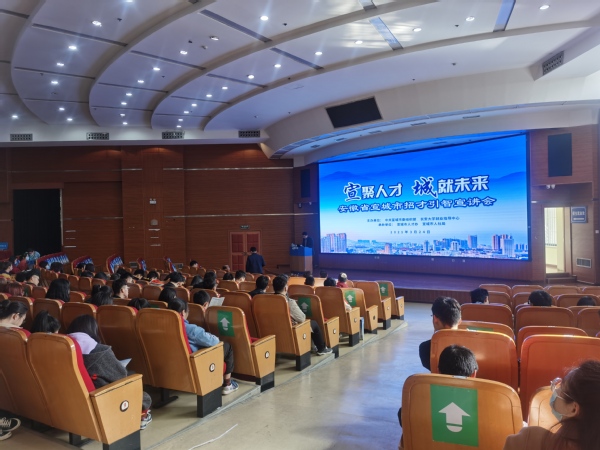 會見后,宣城市招才引智宣講會在北校區圖書館西側報告廳舉辦,唐玉金進行了宣城市人才引進和科技創新支持政策宣講,31家企業現場進行了招聘,我校近百名2021屆畢業生參加了宣講會。會后,宣城市委組織部與招生就業處、機械學院、電控學院、材料學院就人才供需精準對接進行了座談。