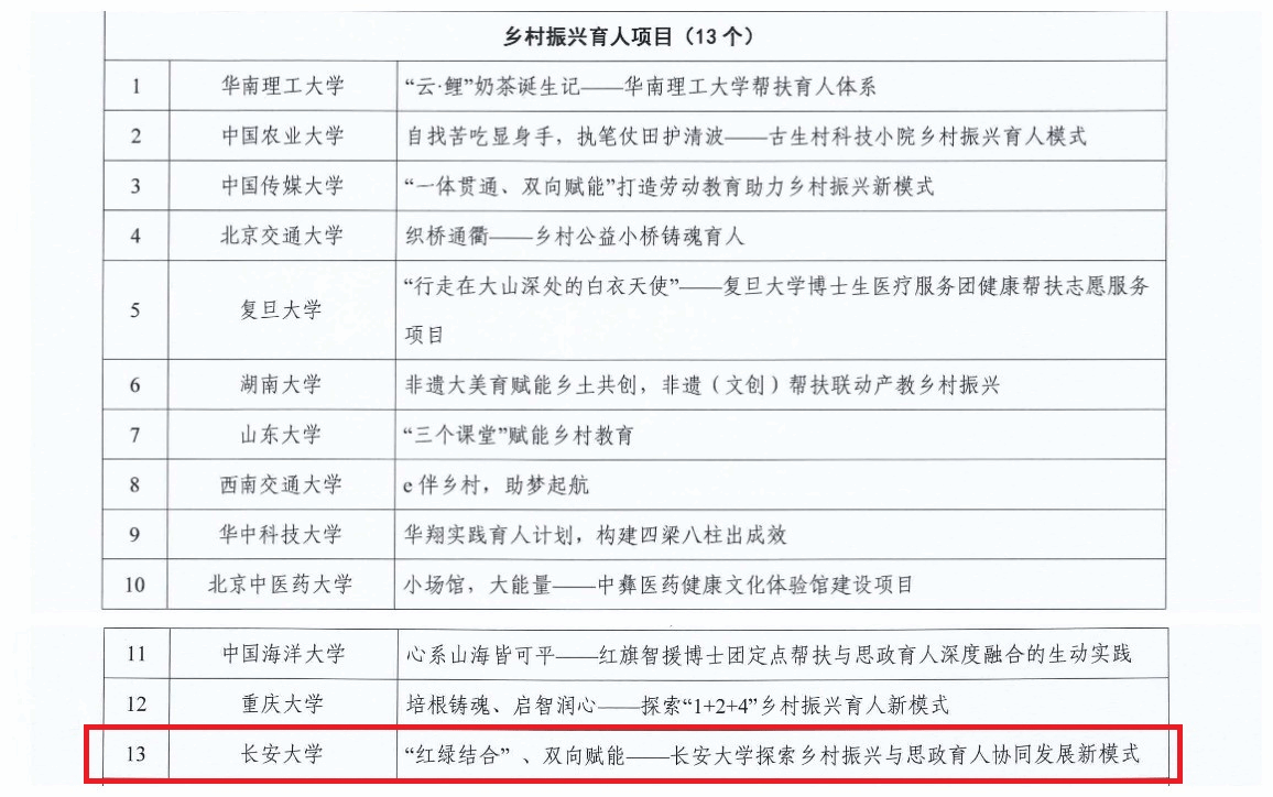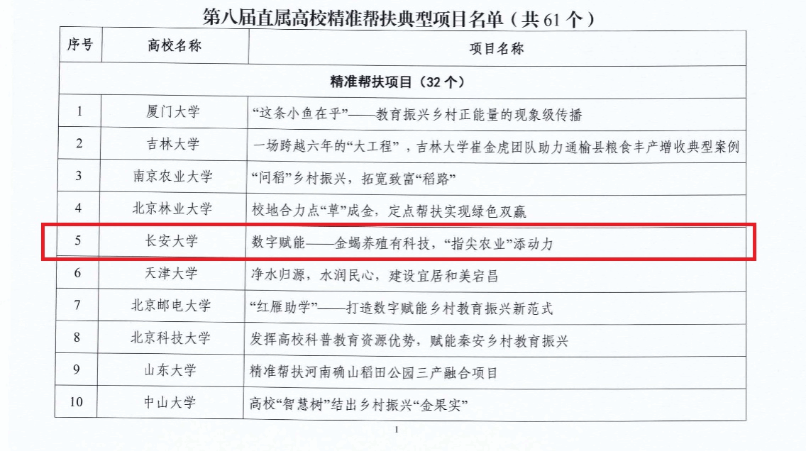 近日,教育部公布了第八屆教育部直屬高校精準幫扶典型項目推選結果,經過學校申報、現場展示和集中評選,我校申報的精準幫扶項目《數字賦能—金蝎養殖有科技,“指尖農業”添動力》和鄉村振興育人項目《“紅綠結合” 雙向賦能—長安大學探索鄉村振興與思政育人協同發展新模式》,入選第八屆教育部直屬高校精準幫扶典型項目。
