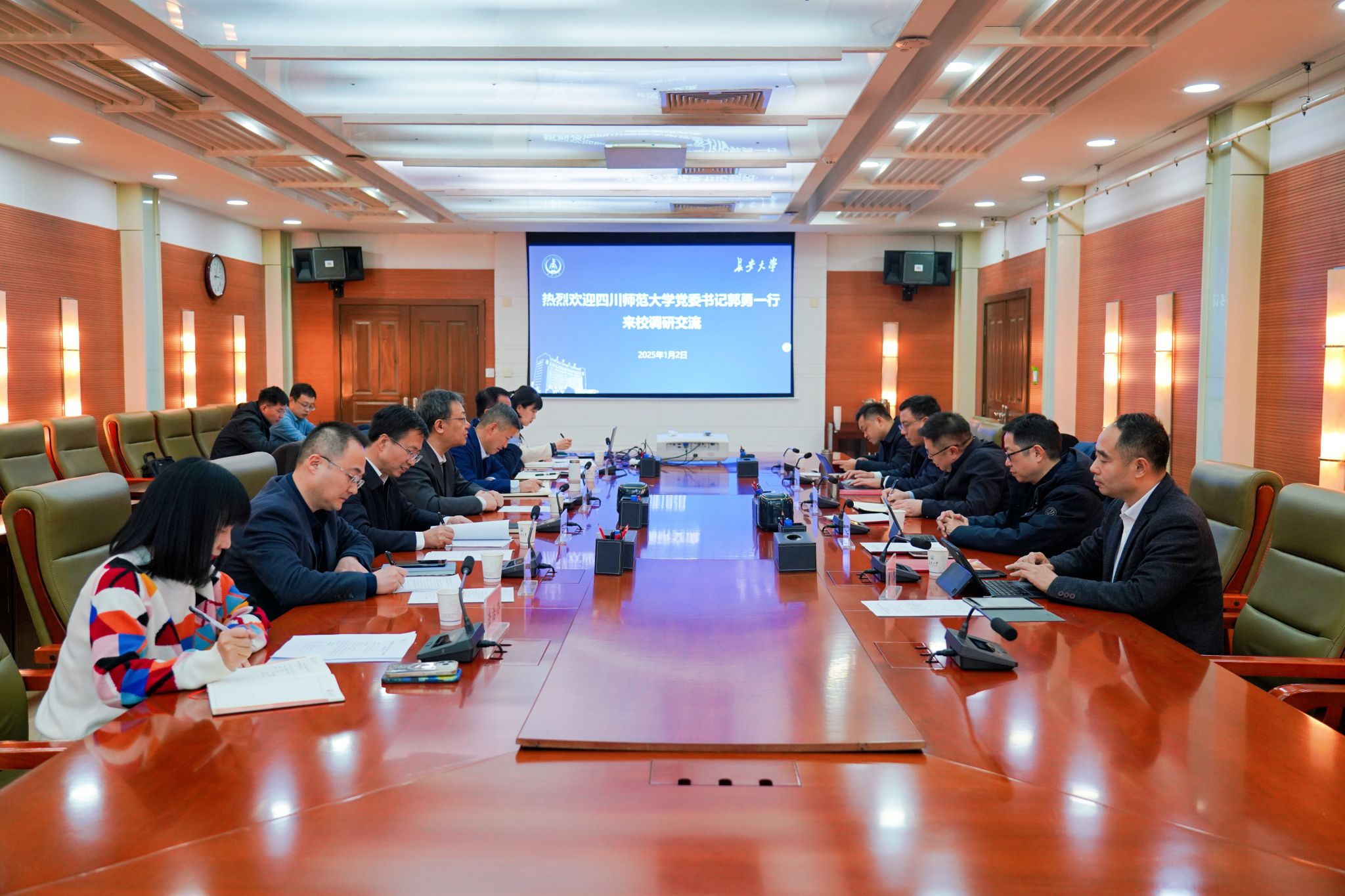 1月2日下午,四川師范大學黨委書記郭勇一行到我校調研交流。四川師范大學副校長陳佑松,黨委常委、組織部部長王澤兵,我校副校長裴建中,黨委常委、組織部部長李文雄出席座談交流會。會議由校黨委書記陳志堅主持。