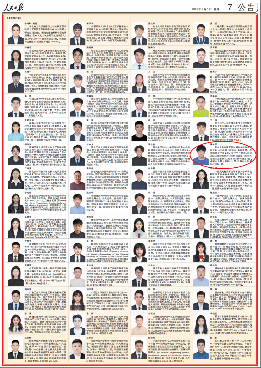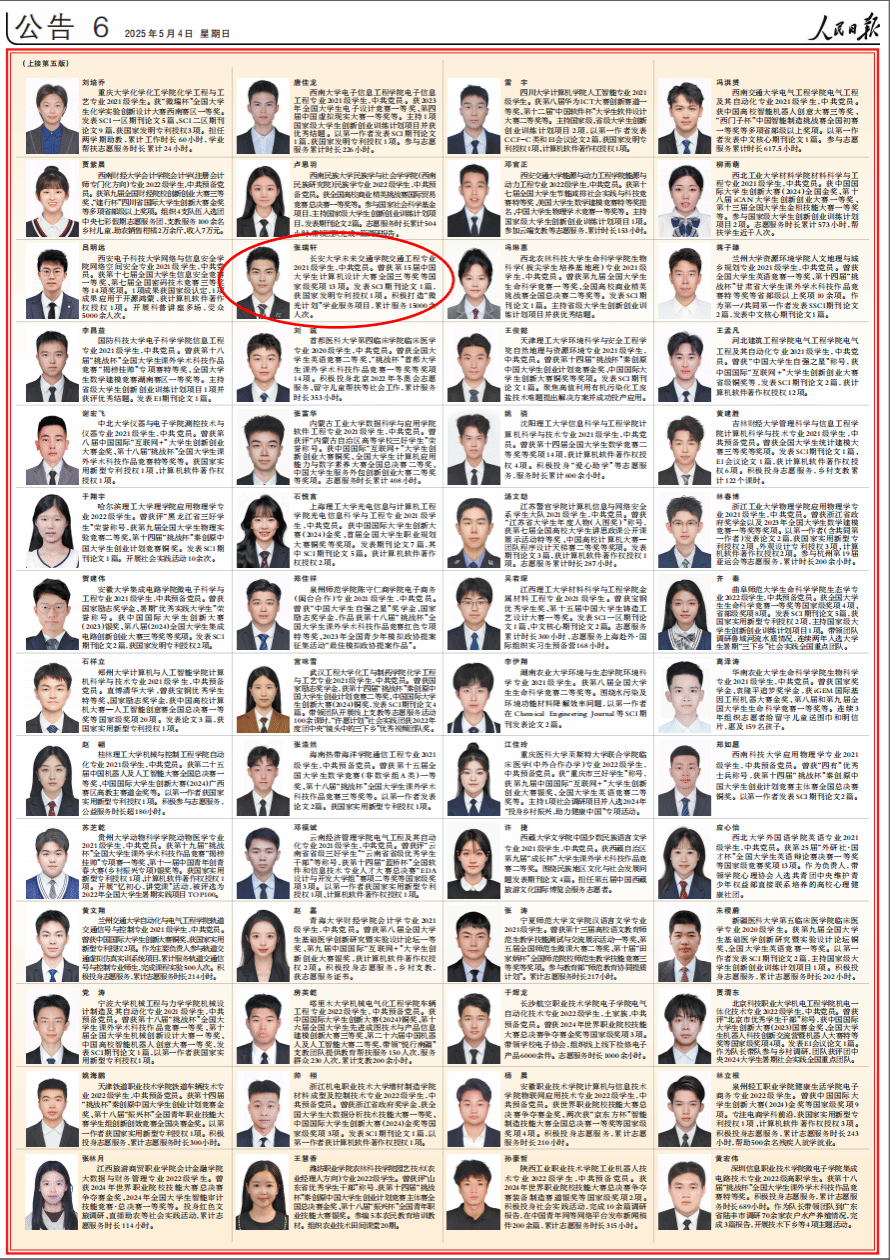 5月4日,《人民日報》刊登《2023-2024學年度本專科生國家獎學金獲獎學生代表名錄》《2024年研究生國家獎學金獲獎學生代表名錄》,我校未來交通學院交通工程專業2021級本科生張瑞軒、地質工程與測繪學院地質工程專業2022級碩士研究生蒲長樂入選。我校已連續三年本科生、研究生雙雙入選國家獎學金獲獎學生代表名錄。