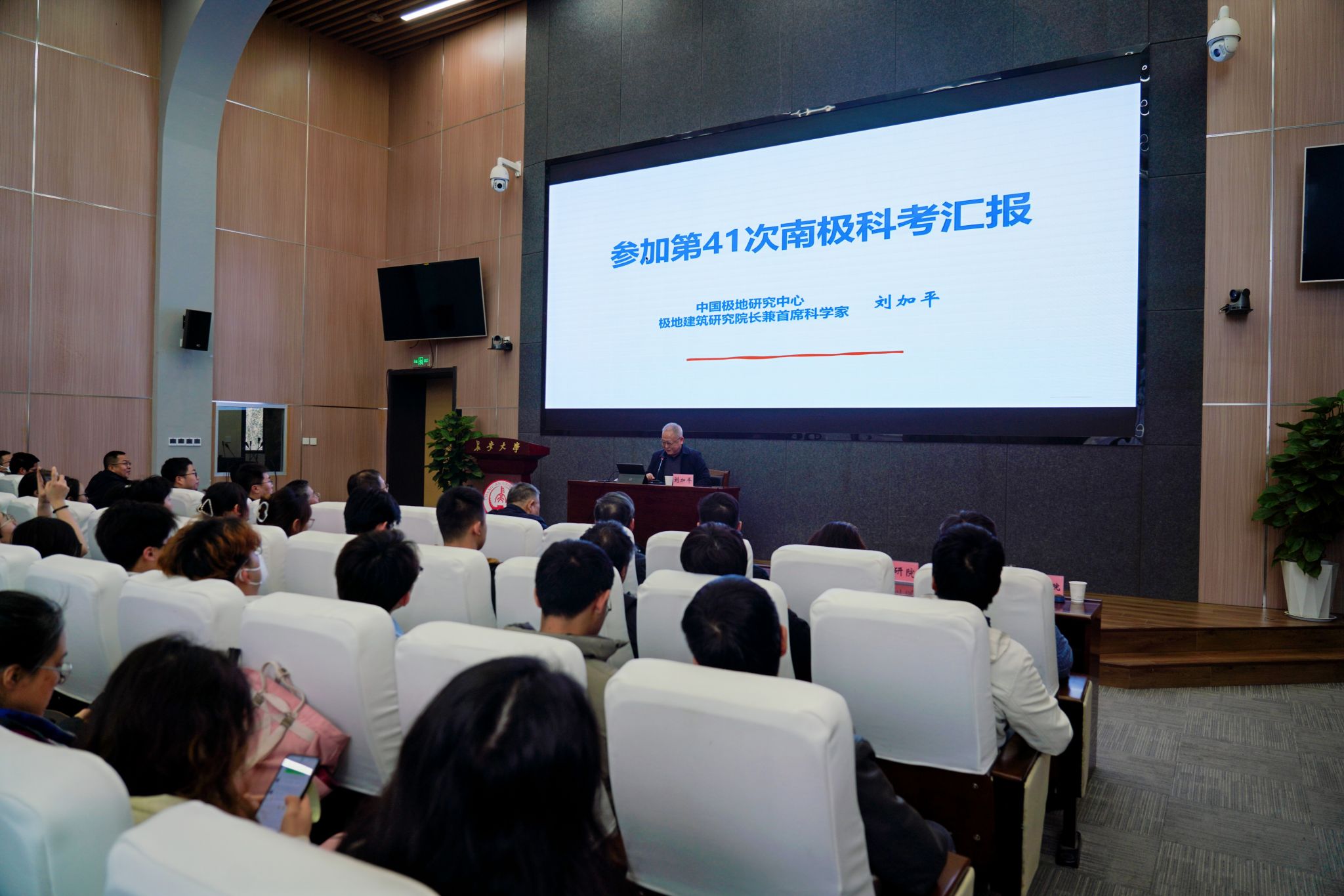 會見結束后,劉加平院士在北校區師生服務大廳第二報告廳作題為“參加第41次南極科考匯報”的學術報告。報告會由陳建勛主持,我校近200名師生參會。