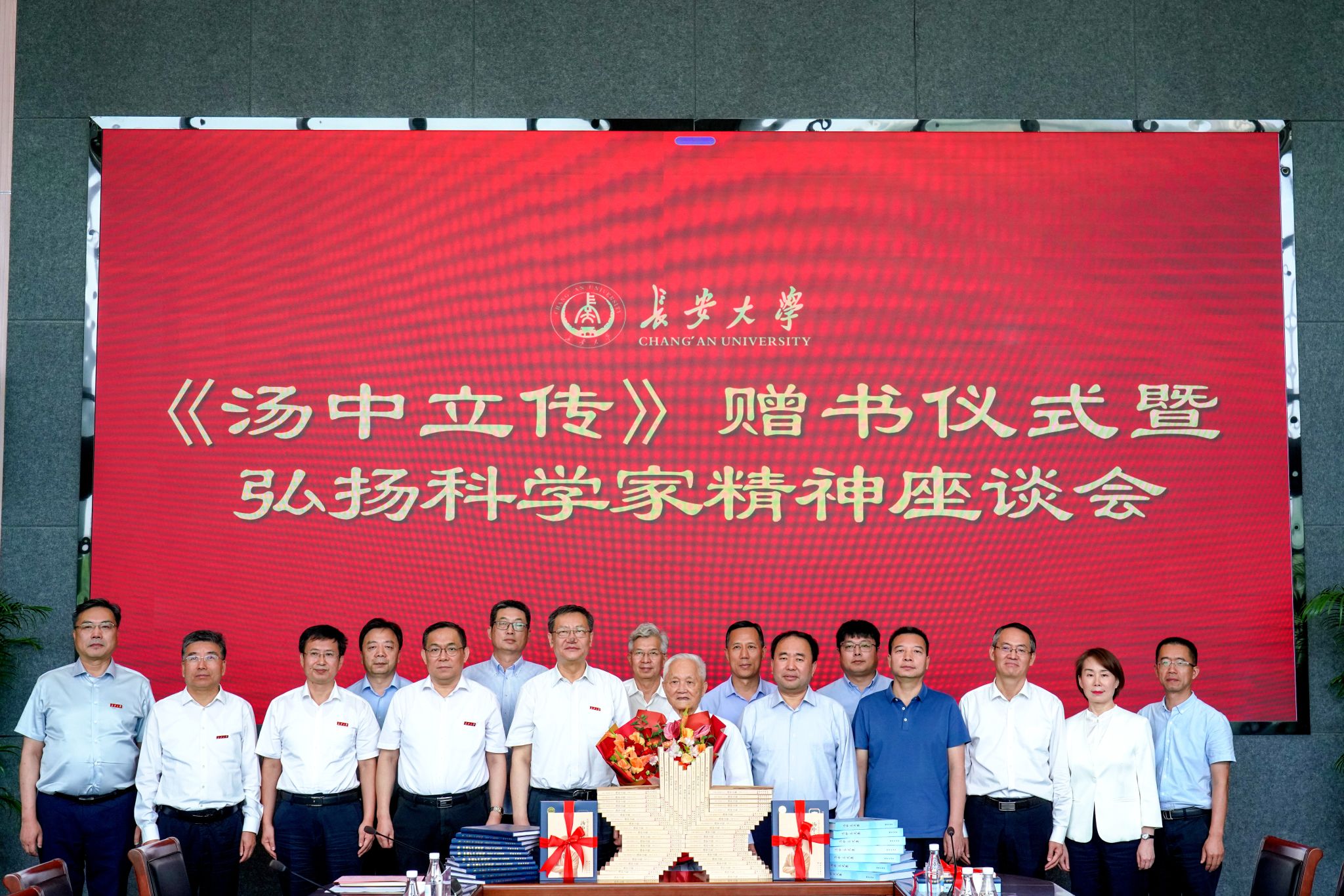 陳志堅、唐淑惠、甘肅省地質(zhì)礦產(chǎn)勘查開發(fā)局黨委副書記成文輝和湯中立教授共同為《湯中立傳》揭幕,湯中立教授向與會各單位、長安大學(xué)圖書館和人才、青年教師代表贈書。