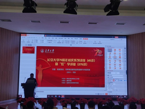 3月27日上午,由研究生院/研究生工作部主辦、建筑學院承辦、校研究生科學技術協會協辦的長安大學70周年校慶系列講座(45講)暨“虹”學講堂(275講)在南校區東院伯聲報告廳順利舉辦。CCDI悉地國際集團總部研究總監艾俠作了題為“高度游戲:世界高層建筑趨勢觀察與中國實踐”的報告,我校相關學院共計220名余名師生參加了此次講座。