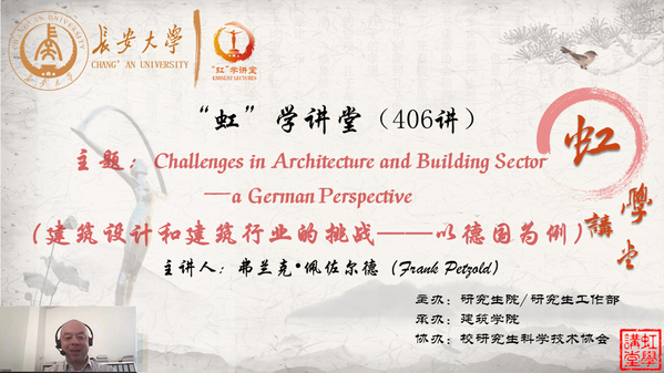 11月27日下午,由研究生院/研究生工作部主辦、建筑學院承辦、校研究生科學技術協會協辦的“虹”學講堂第406講以線上講座形式順利舉辦。德國慕尼黑工業大學弗蘭克?佩佐爾德教授作了題為《建筑設計和建筑行業的挑戰——以德國為例》(Challenges in Architecture and Building Sector—a GermanPerspective)的報告,相關學院共360余名師生參加講座。