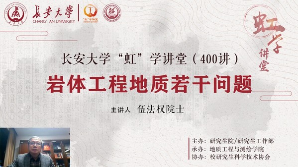 第二階段為“虹”學講堂400講講座,俄羅斯自然科學院院士、紹興文理學院教授伍法權作了題為“巖體工程地質若干問題”的報告,地質工程與測繪學院石玉玲老師主持。伍法權教授主要圍繞巖體工程地質基礎理論、巖體工程的技術問題以及巖體工程中的熱點問題三個部分展開。伍法權教授指出,巖體力學理論應用、技術發展和關鍵地質問題的解決是國家大規模基礎設施建設的基本條件,巖體力學理論要從定性、半定量轉向建立嚴密理論體系,巖體工程要進行便捷化、數字化、智能化底層技術改造和提升。