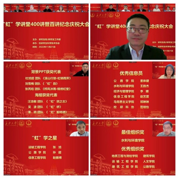 11月21日晚,由研究生院/研究生工作部主辦、校研究生科學技術協會承辦的長安大學“虹”學講堂400講暨百講紀念慶祝大會以線上形式順利舉辦。研究生院執行院長吳濤、地質工程與測繪學院院長李振洪、思創中心辦公室主任郭云珠、建筑學院黨委副書記劉鵬,研究生工作部全體人員以及各學院研究生代表共計450余人參加此次活動。