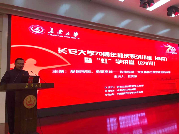 4月1日下午,由研究生院/研究生工作部主辦、水利與環境學院承辦、校研究生科學技術協會協辦的長安大學70周年校慶系列講座(48講)暨“虹”學講堂(278講)在南校區北院學術交流中心報告廳順利舉辦。自然資源部第一大地測量隊黨委委員任秀波作了題為“愛國報國、勇攀高峰——傳承國測一大隊精神之數字背后的故事”的報告。本次報告由水環學院魏瑋老師主持,我校相關學院共計260余名師生參加了此次講座。