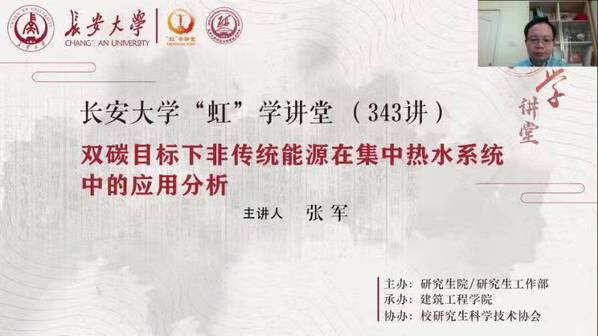 1月18日下午,由研究生院/研究生工作部主辦、建筑工程學院承辦、校研究生科學技術協(xié)會協(xié)辦的“虹”學講堂第343講以線上講座形式順利舉辦。中國建筑西北設計研究院有限公司教授級高級工程師張軍作了題為“雙碳目標下非傳統(tǒng)能源在集中生活熱水系統(tǒng)中的應用分析”的報告,相關學院共330余名師生參加了講座。