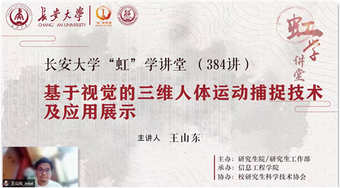 6月9日晚,由研究生院/研究生工作部主辦、信息工程學院承辦、校研究生科學技術協會協辦的“虹”學講堂第384講以線上講座形式舉行。英特爾中國研究院高級主任研究員王山東作了題為“基于視覺的三維人體運動捕捉技術及應用展示”的報告,相關學院共150余名師生參加講座。