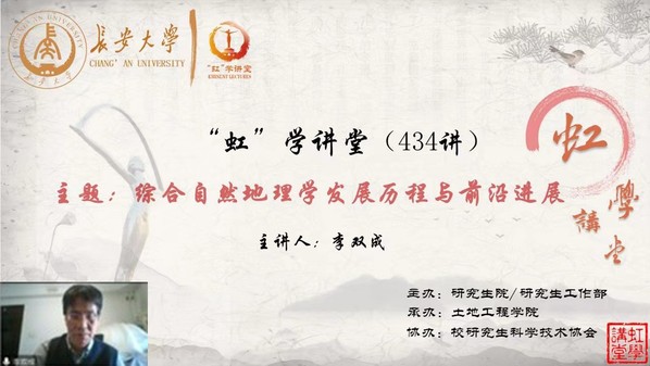 3月18日上午,由研究生院/研究生工作部主辦、土地工程學院承辦、校研究生科學技術協(xié)會協(xié)辦的“虹”學講堂434講以線上線下相結(jié)合的形式順利舉辦。北京大學李雙成教授作了題為“綜合自然地理學發(fā)展歷程與前沿進展”的報告,土地工程學院王曉峰教授主持,相關學院共300余名師生參加講座。