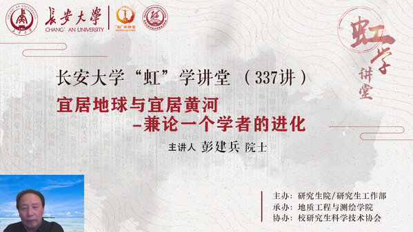 為深入貫徹習近平總書記關于加強疫情防控的重要指示精神,全面落實中央、省、市、區部署要求,幫助廣大師生平穩充實地渡過特殊時期,充實豐富封閉期間的科研學習生活,1月1日上午,由研究生院/研究生工作部主辦、地質工程與測繪學院承辦、校研究生科學技術協會協辦的“虹”學講堂第337講以線上講座形式順利舉辦。彭建兵院士應邀為我校師生作了題為《宜居地球與宜居黃河——兼論一個學者的進化》的學術報告。地測學院黨政領導、兄弟院校的學者及來自各學院的1220余名師生聆聽報告。報告會由地測學院院長李振洪主持。