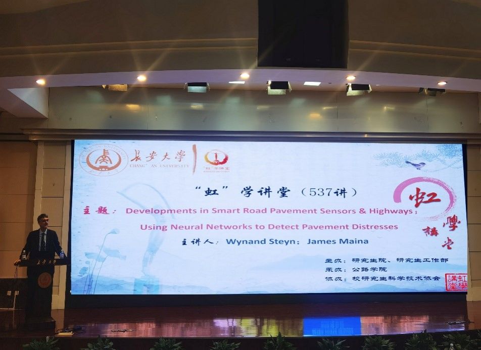 3月23日上午,由研究生院、研究生工作部主辦,公路學院承辦,校研究生科學技術協會協辦的“虹”學講堂第537講在南校區北院學術交流中心舉行。南非比勒陀利亞大學Wynand Steyn與James Maina教授分別作題為“Developments in Smart Road Pavement Sensors & Highways”與“Using Neural Networks to Detect Pavement Distresses”的報告,公路學院馬峰教授主持報告會,相關學院共200余名師生參加講座。