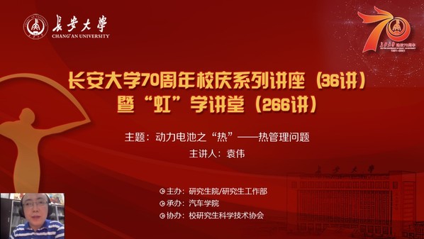 3月17日晚,由研究生院/研究生工作部主辦、汽車學院承辦、校研究生科學技術協會協辦的長安大學70周年校慶系列講座(36講)暨“虹”學講堂(266講)通過“騰訊課堂”以線上直播形式順利舉辦。華南理工大學機械與汽車工程學院袁偉教授作了題為“動力電池之‘熱’——熱管理問題”的報告,我校相關學院共計290余名師生參加了此次線上講座。