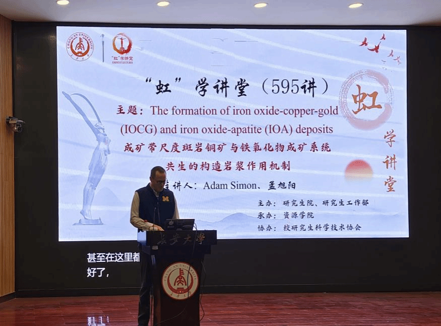 11月11日上午,由研究生院、研究生工作部主辦,地球科學與資源學院承辦,校研究生科學技術協會協辦的“虹”學講堂第595講在南校區東院伯聲報告廳舉辦。密歇根大學Adam Simon教授作題為“The formation of iron oxide-copper-gold (IOCG) and iron oxide-apatite (IOA) deposits”的報告,中國地質大學(北京)孟旭陽教授作題為“成礦帶尺度斑巖銅礦與鐵氧化物成礦系統共生的構造巖漿作用機制”的報告,資源學院楊秀清教授主持報告會,相關學院共120余名師生參加講座。