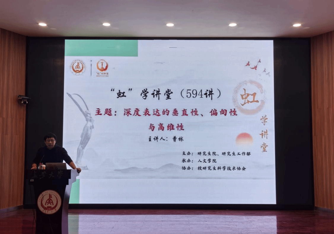11月9日下午,由研究生院、研究生工作部主辦,人文學(xué)院承辦,校研究生科學(xué)技術(shù)協(xié)會協(xié)辦的“虹”學(xué)講堂第594講在南校區(qū)東院伯聲報告廳舉辦。華中科技大學(xué)曹林教授作題為“深度表達(dá)的垂直性、偏向性與高維性”的報告,人文學(xué)院杜波教授主持報告會,相關(guān)學(xué)院共110余名師生參加講座。