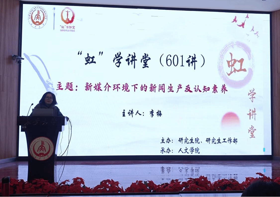 11月26日下午,由研究生院、研究生工作部主辦,人文學院承辦,校研究生科學技術協會協辦的“虹”學講堂第601講在南校區東院伯聲報告廳舉辦。華南理工大學李梅教授作題為“新媒介環境下的新聞生產及認知素養”的報告,人文學院張娜副教授主持報告會,相關學院共150余名師生參加講座。