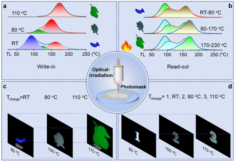 熒光高端智能防偽材料是解決目前全球性偽造問題的一個(gè)重要研究方向,張翔宇團(tuán)隊(duì)長(zhǎng)期致力于熒光長(zhǎng)余輝發(fā)光材料的研究,發(fā)表的研究成果通過摻雜構(gòu)建局部深陷阱和增加深陷阱填充能力的策略,設(shè)計(jì)并開發(fā)了一種新型多波段NaGdGeO4:Pb,Tb長(zhǎng)余輝存儲(chǔ)熒光粉,不僅展現(xiàn)出多模白光發(fā)射,而且通過記憶陷阱的充能溫度,實(shí)現(xiàn)對(duì)環(huán)境溫度的智能響應(yīng)和在單個(gè)熒光粉記錄層上實(shí)現(xiàn)高通量多通道的熒光防偽。本研究不僅對(duì)余輝熒光機(jī)制提供了進(jìn)一步的認(rèn)識(shí),也為構(gòu)建智能響應(yīng)防偽材料打開了新的應(yīng)用領(lǐng)域。