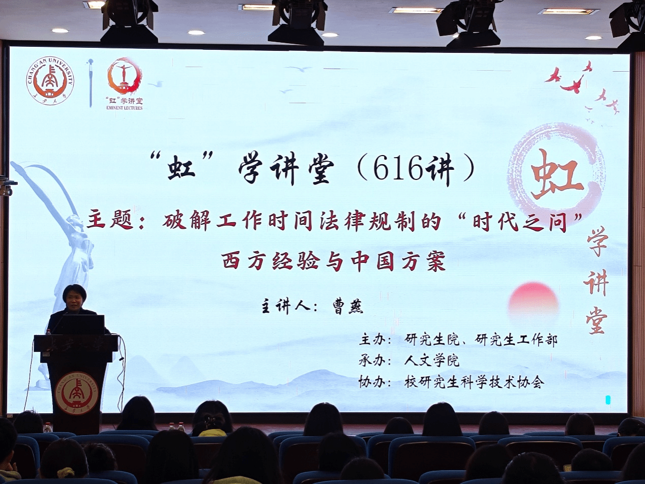 3月18日晚,由研究生院、研究生工作部主辦,人文學院承辦,校研究生科學技術協會協辦的“虹”學講堂第616講在南校區東院伯聲報告廳舉辦。西北政法大學曹燕教授作題為“破解工作時間法律規制的‘時代之問’西方經驗與中國方案”的報告,相關學院共130余名師生參加講座。